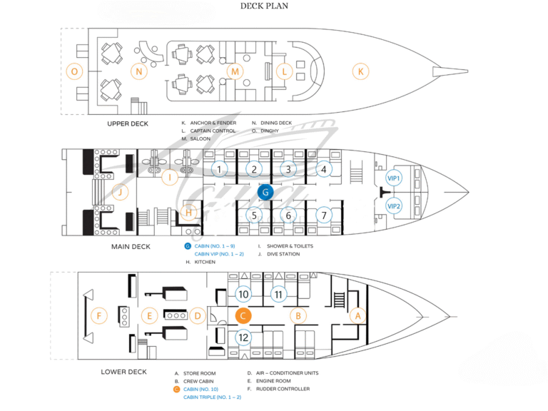 MV Aqua는 길이 34m, 폭 6.5m의 강철 다이빙 리브어보드로, 에어컨이 완비된 2인용 공용 선실에서 최대 24명의 다이버를 수용할 수 있습니다. 마스터 선실 2개, 디럭스 선실 3개, 스탠다드 선실 7개, 총 3가지 유형의 선실을 갖추고 있습니다. 모든 선실에는 샤워실과 화장실이 딸려 있습니다. 선실 밖에서 시간을 보내고 싶다면, 에어컨이 완비된 편안한 라운지에서 85인치 TV 화면으로 수백 편의 영화를 감상하며 즐거운 시간을 보내실 수도 있습니다.