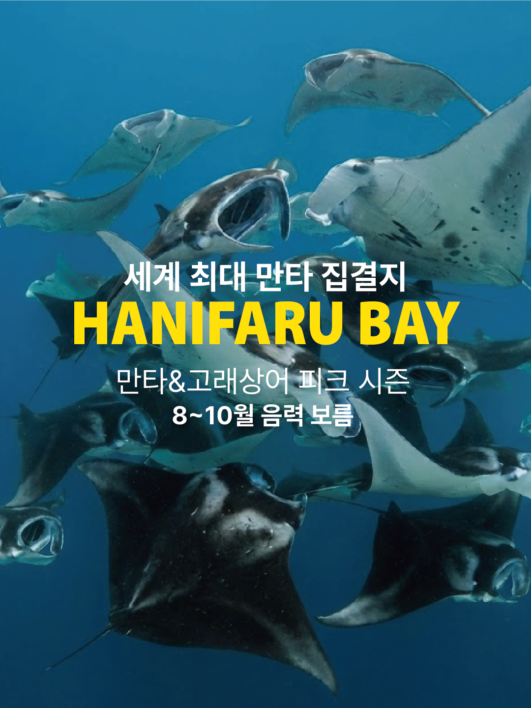 유네스코 보호구역인 바 아톨(Baa Atoll) 하니파루 베이에서 수십수백 마리의 만타레이가 춤추는 장관을 스노클링으로 만납니다. 그 규모와 만타 수는 세계 최대라고 할 수 있습니다.
