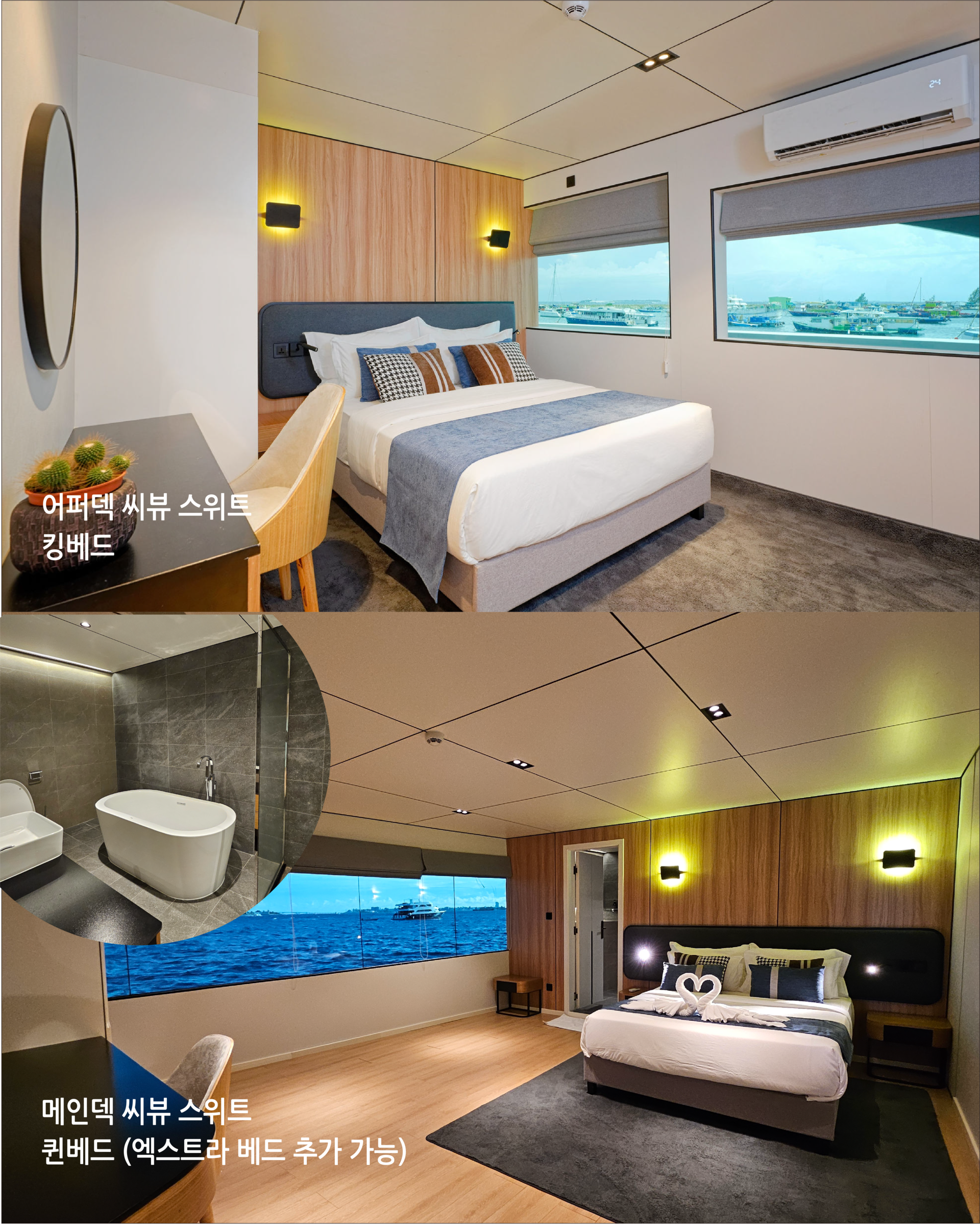 | 위치:메인덱 캐빈 수량: 2개 캐빈 정원: 2인 침대 구성: 퀸베드 (요청 시 엑스트라 베드 추가 가능) 냉방시설: 개별 에어컨 화장실: 객실 내 개별 샤워시설 및 화장실, 욕조, 화장대, 미니냉장고 |